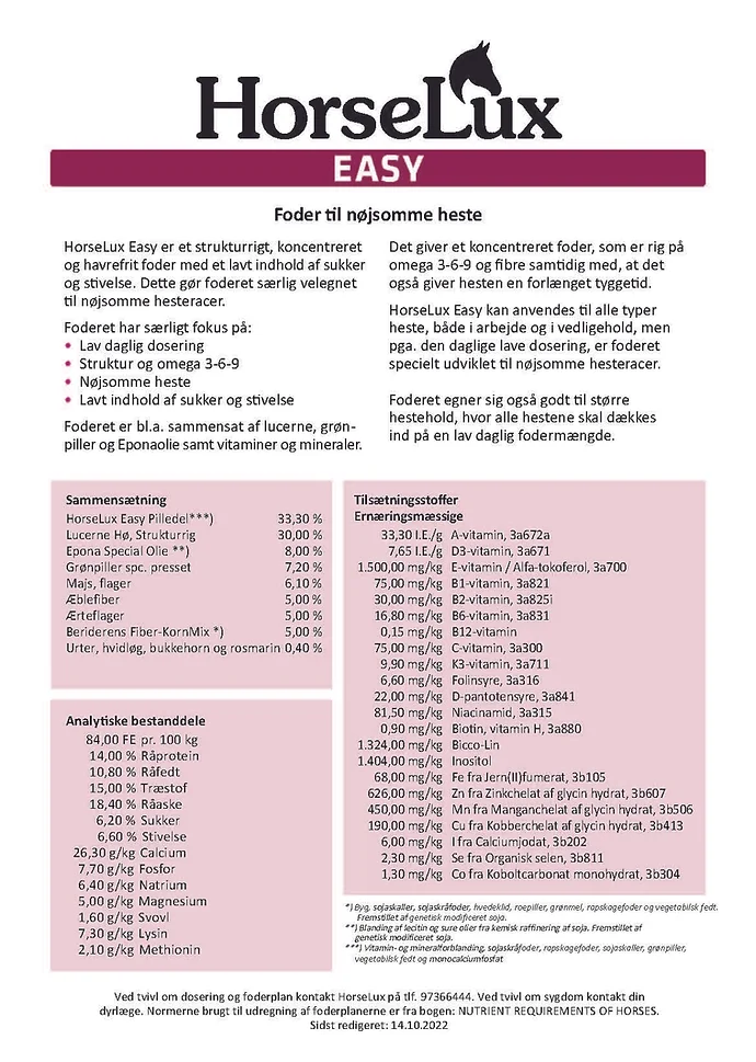 HorseLux Easy er et strukturrigt, koncentreret og havrefrit foder med et lavt indhold af sukker og stivelse. Dette gør foderet særlig velegnet til nøjsomme hesteracer, f.eks. shetlændere, islændere, koldblodsracer, fjordheste o.lign.