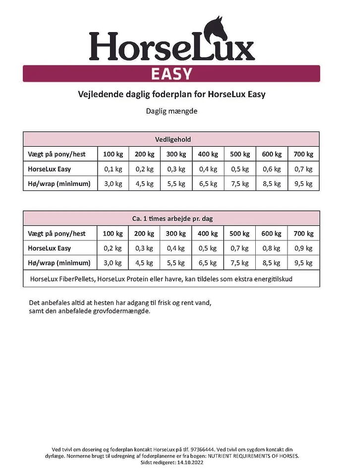 HorseLux Easy kan anvendes til alle typer heste, både i arbejde og i vedligehold, men pga. den daglige lave dosering, er foderet specielt udviklet til nøjsomme hesteracer.