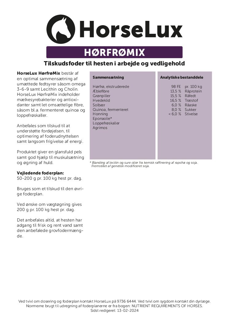 Med lavt indhold af sukker og stivelse er HorseLux HørfrøMix det ideelle fodersupplement til din hests trivsel.