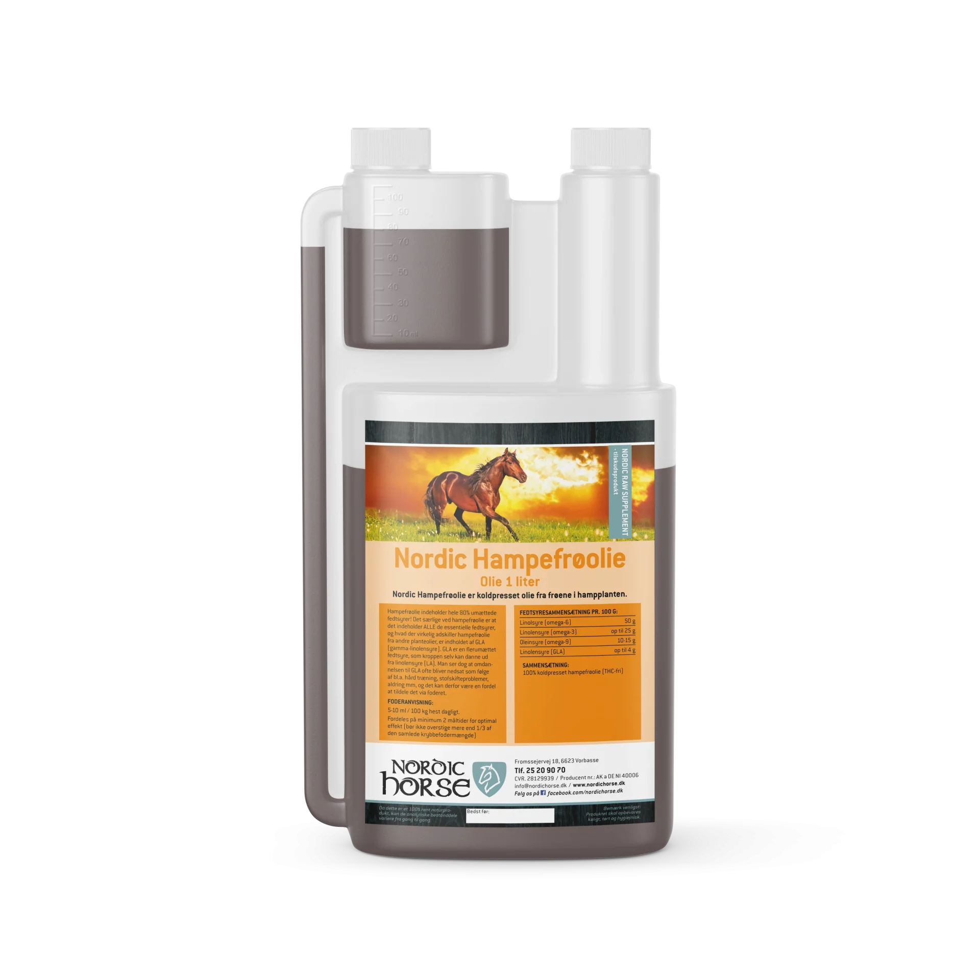 Nordic Hampefrøolie er koldpresset olie fra frøene i hampplanten. Det specielle ved hampefrøolie er at det indeholder ALLE de essentielle fedtsyrer. Hampefrøolie supplerer ikke kun med Omega-3 og Omega-6, men også Omega-9. Hvad der virkelig adskiller hampefrøolie fra andre planteolier, er indholdet af GLA (gamma-linolensyre). GLA er en flerumættet fedtsyre, som kroppen selv kan danne ud fra linolensyre (LA). Man ser dog at omdannelsen til GLA ofte bliver nedsat som følger af bl.a. hård træning, stofskifteproblemer, aldring mm, og det kan derfor være en fordel at tildele det via foderet. GLA-mangel ses bl.a. også som et ledsagefænomen til overvægt og insulinresistens.