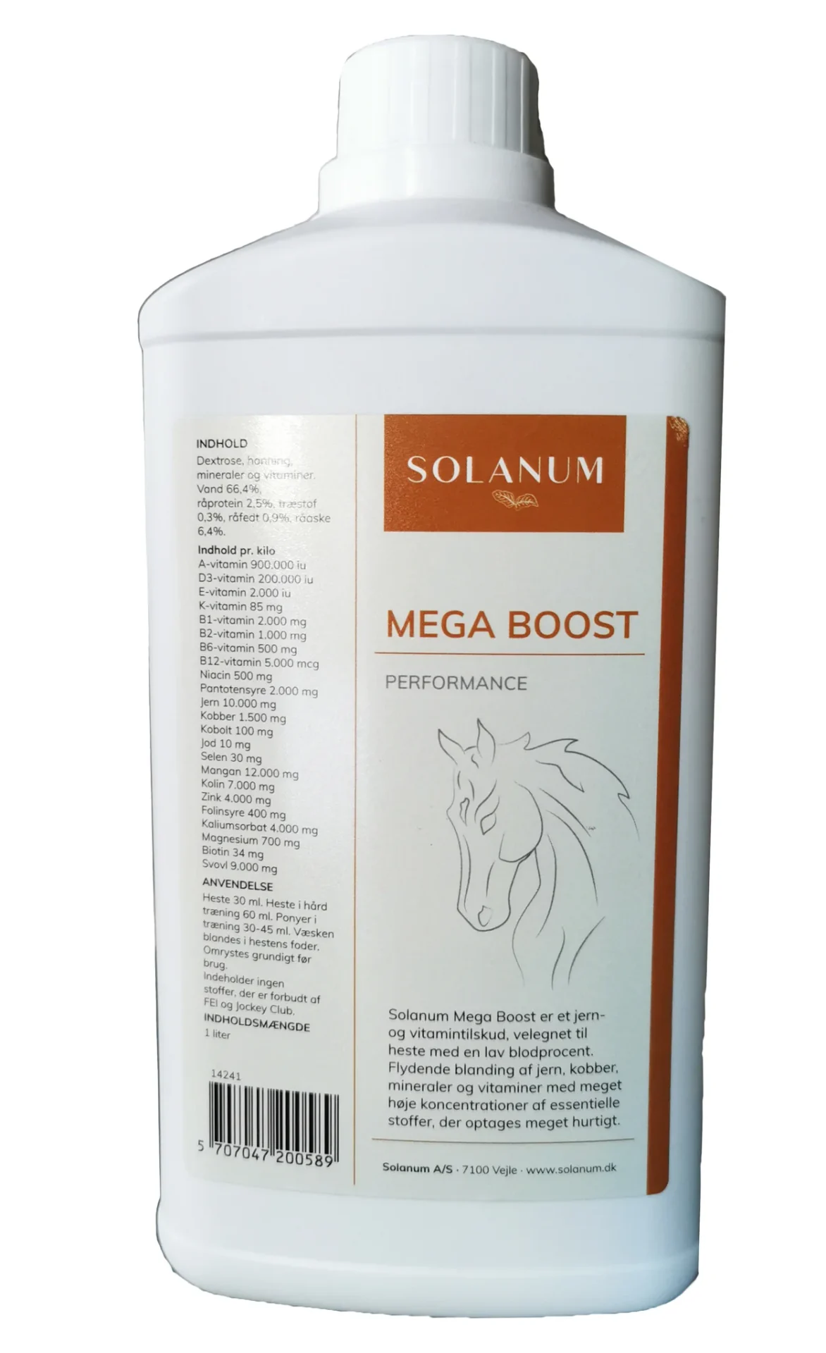 Solanum Mega Boost er et jern- og vitamintilskud, velegnet til heste med en lav blodprocent.